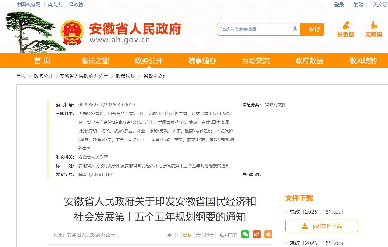 安徽省人民政府近日印发《安徽省国民经济和社会发展第十五个五年规划纲要》(以下简称《纲要》)。《纲要》根据党的二十届四中全会精神和《中共安徽省委关于制定国民经济和社会发展第十五个五年规划的建议》编制,主要阐明全省发展战略意图,明确政府工作重点,引导规范经营主体行为,是“十五五”时期经济社会发展的宏伟蓝图,是全省人民共同奋斗的行动纲领。《纲要》明确: