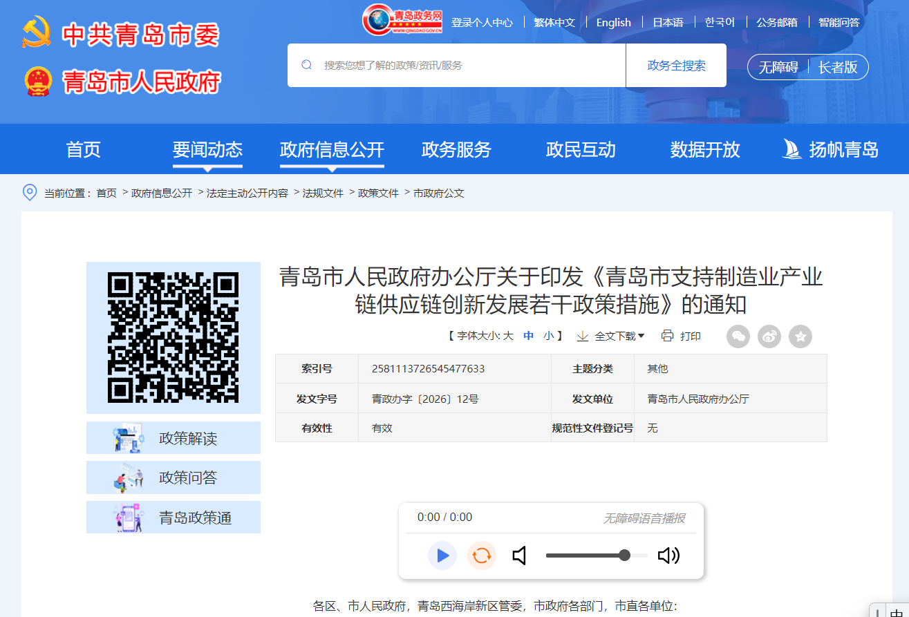 青岛市支持制造业产业链供应链创新发展若干政策措施