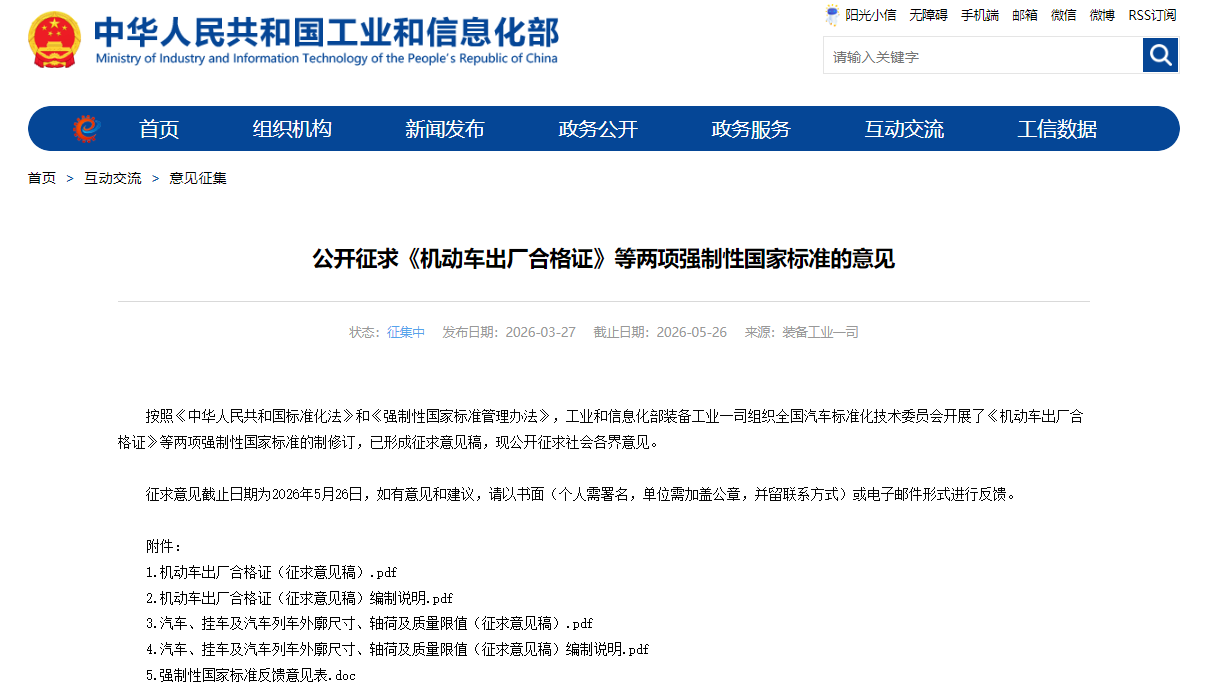 按照《中华人民共和国标准化法》和《强制性国家标准管理办法》,工业和信息化部装备工业一司组织全国汽车标准化技术委员会开展了《汽车、挂车及汽车列车外廓尺寸、轴荷及质量限值》等两项强制性国家标准的制修订,已形成征求意见稿,现公开征求社会各界意见。