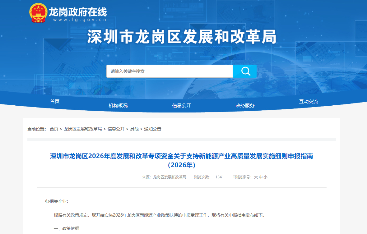 根据相关政策规定,深圳市龙岗区发展和改革局现开始实施2026年龙岗区新能源产业政策扶持的申报受理工作,并发布有关申报指南。