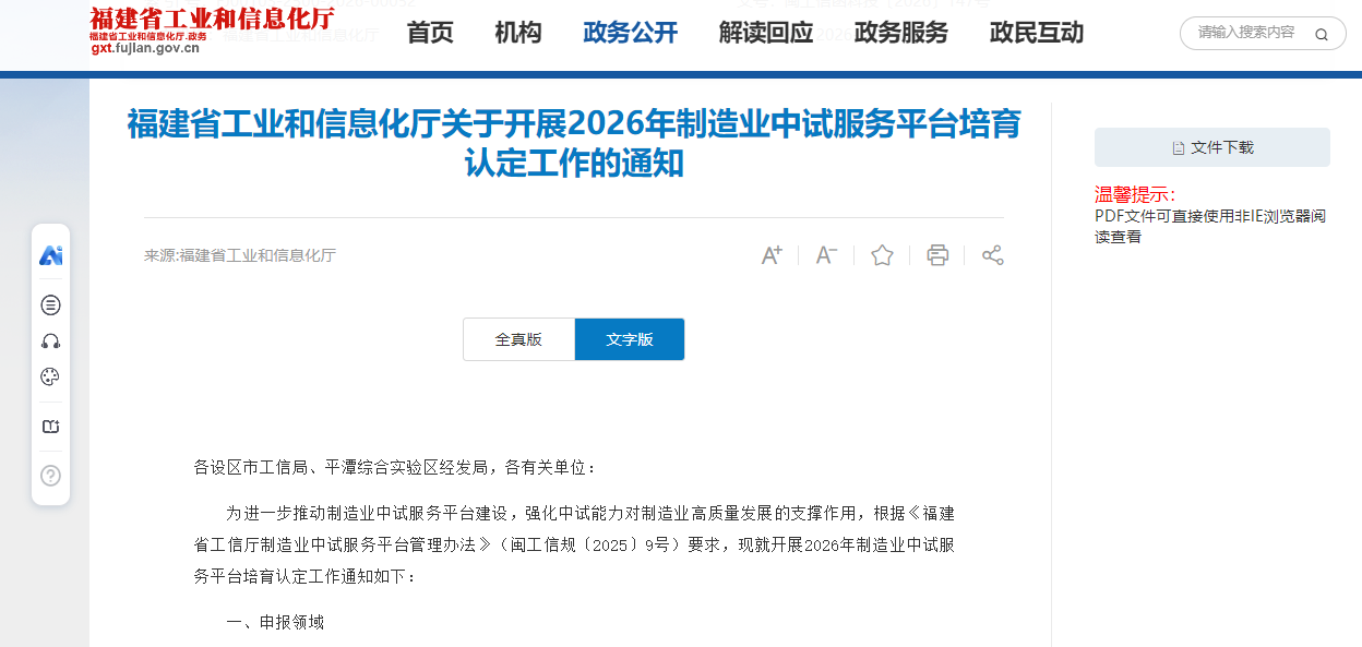 为进一步推动制造业中试服务平台建设,强化中试能力对制造业高质量发展的支撑作用,根据《福建省工信厅制造业中试服务平台管理办法》要求,福建省工业和信息化厅现开展2026年制造业中试服务平台培育认定工作。