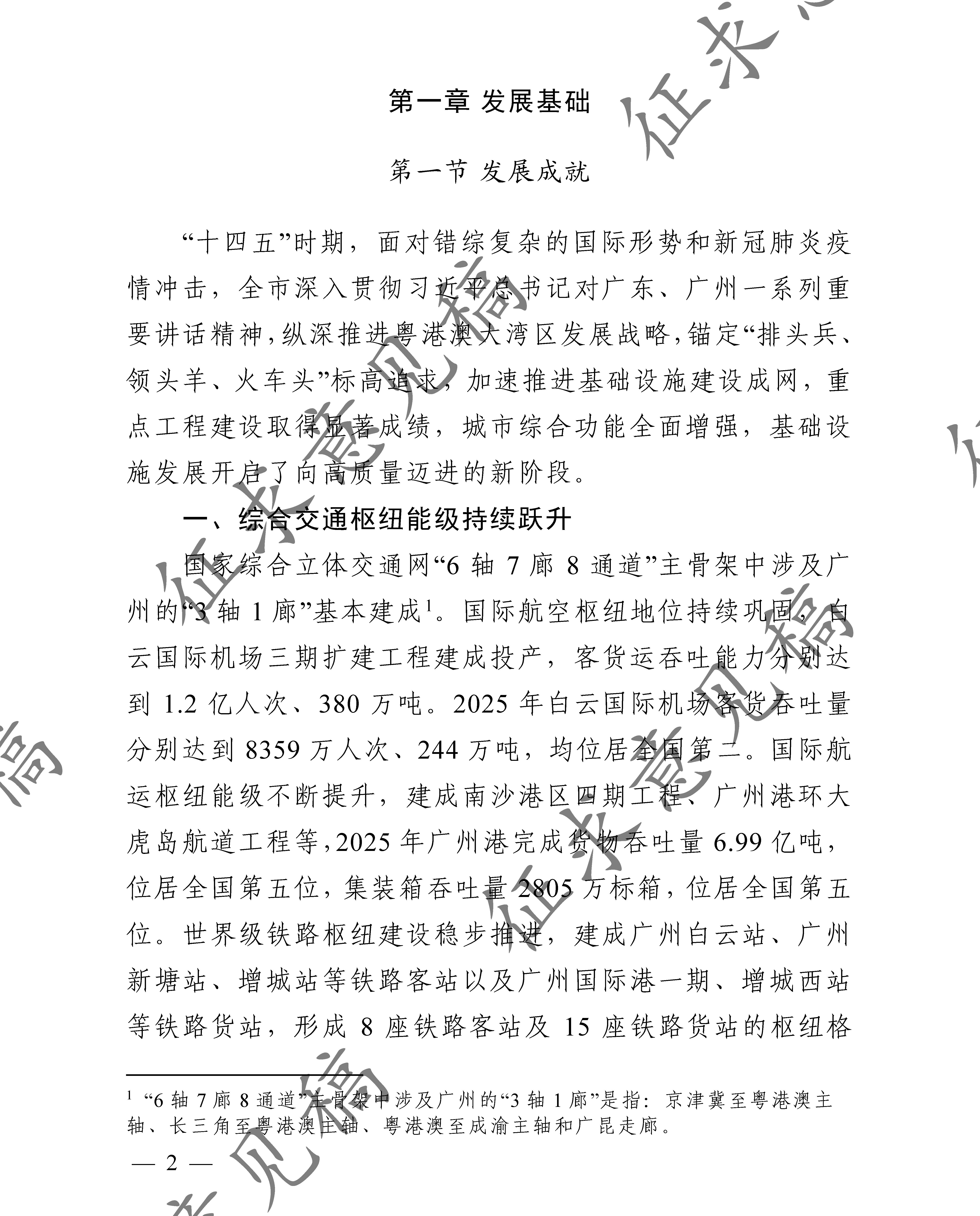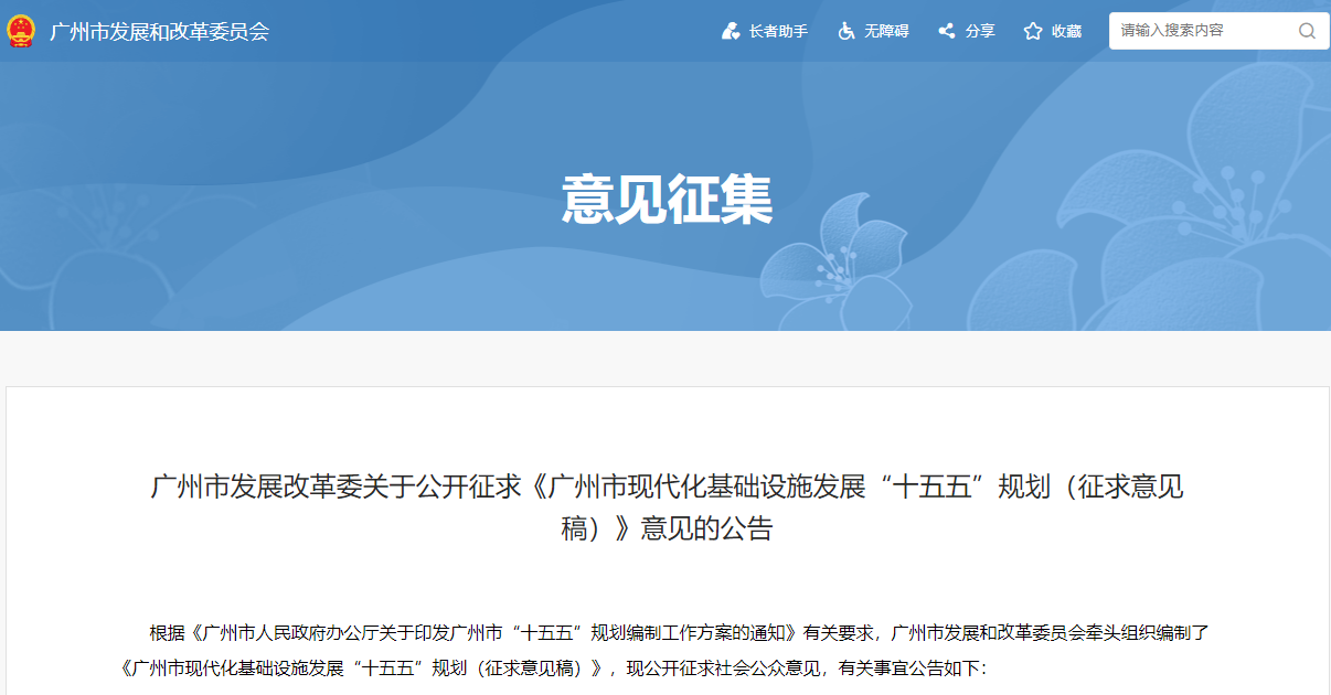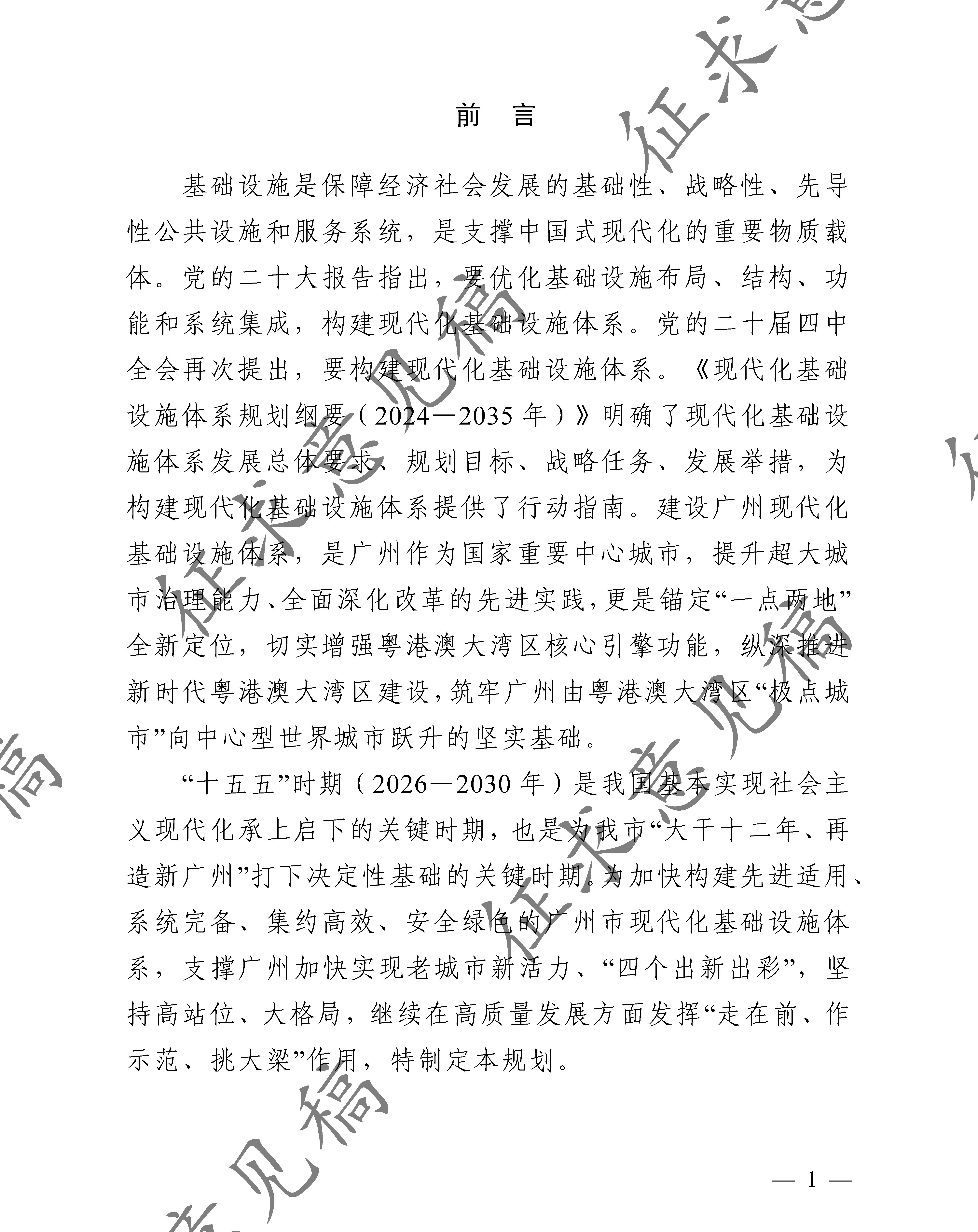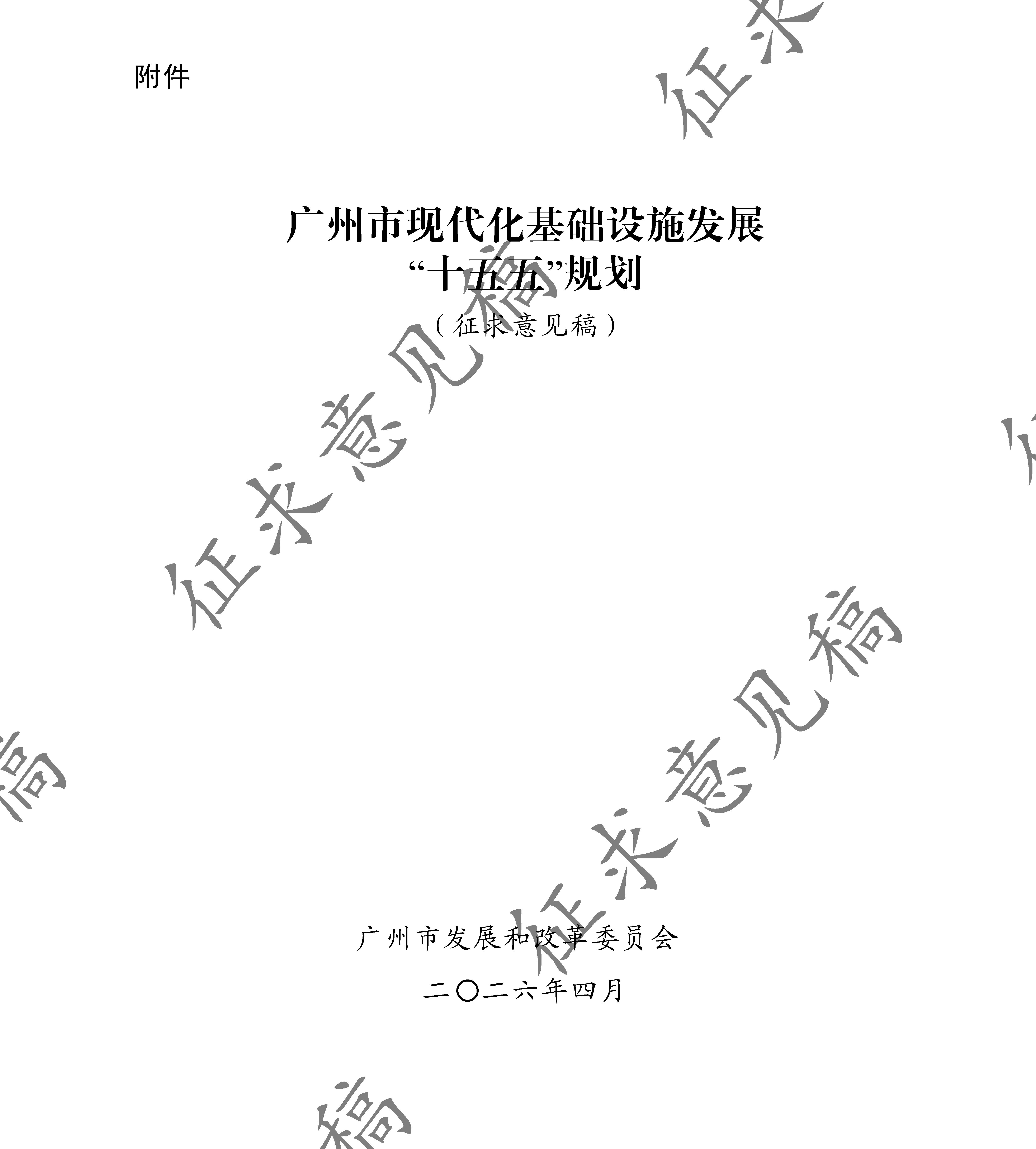 为加快构建先进适用、系统完备、集约高效、安全绿色的广州市现代化基础设施体系,支撑广州加快实现老城市新活力、“四个出新出彩”,坚持高站位、大格局,继续在高质量发展方面发挥“走在前、作示范、挑大梁”作用, 广州市发展和改革委员会牵头组织编制了《广州市现代化基础设施发展“十五五”规划(征求意见稿)》并于近日发布。《征求意见》明确:
