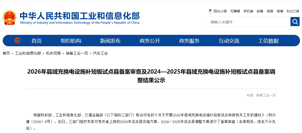 财政部经济建设司、工业和信息化部装备工业一司、交通运输部公路局(以下简称“三部门”)联合发布《2026年县域充换电设施补短板试点县备案审查及2024—2025年县域充换电设施补短板试点县备案调整结果公示》。《公示》显示: