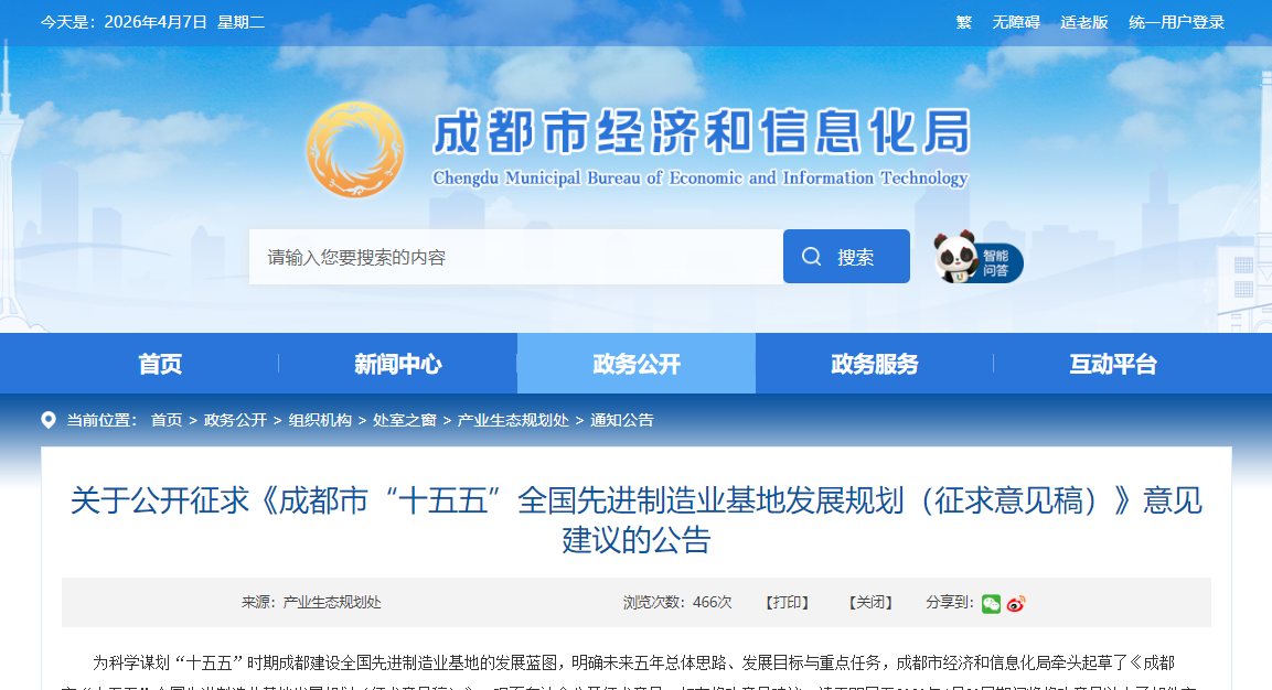 为科学谋划“十五五”时期成都建设全国先进制造业基地的发展蓝图,明确未来五年总体思路、发展目标与重点任务,成都市经济和信息化局牵头起草了《成都市“十五五”全国先进制造业基地发展规划(征求意见稿)》并于近日发布。《征求意见》明确: