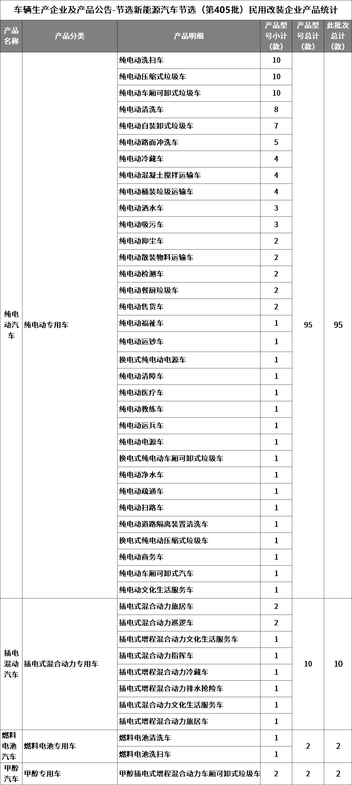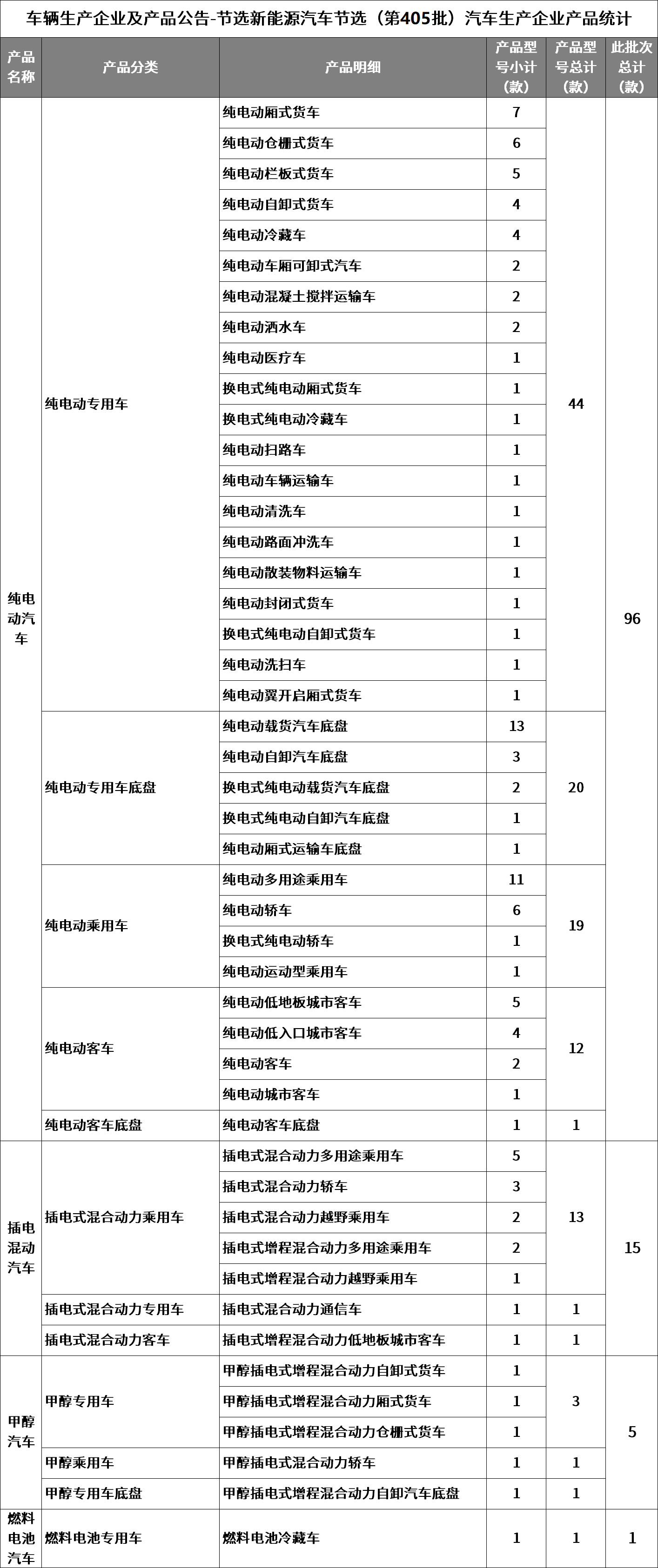 2、燃料种类:本批次纯电动产品共计191个(包含:乘用车19个,客车12个,客车底盘1个,专用车139个,专用车底盘20个);插电式混合动力产品25个(包含:乘用车13个,客车1个,专用车11个);燃料电池产品3个(包含:专用车3个);甲醇产品7个(包含:乘用车1个,专用车5个,专用车底盘1个)。