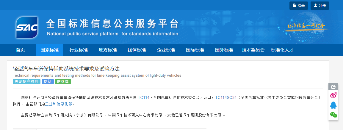 国家标准计划《轻型汽车车道保持辅助系统技术要求及试验方法》由全国汽车标准化技术委员会归口,全国汽车标准化技术委员会智能网联汽车分会执行 ,主管部门为工业和信息化部。