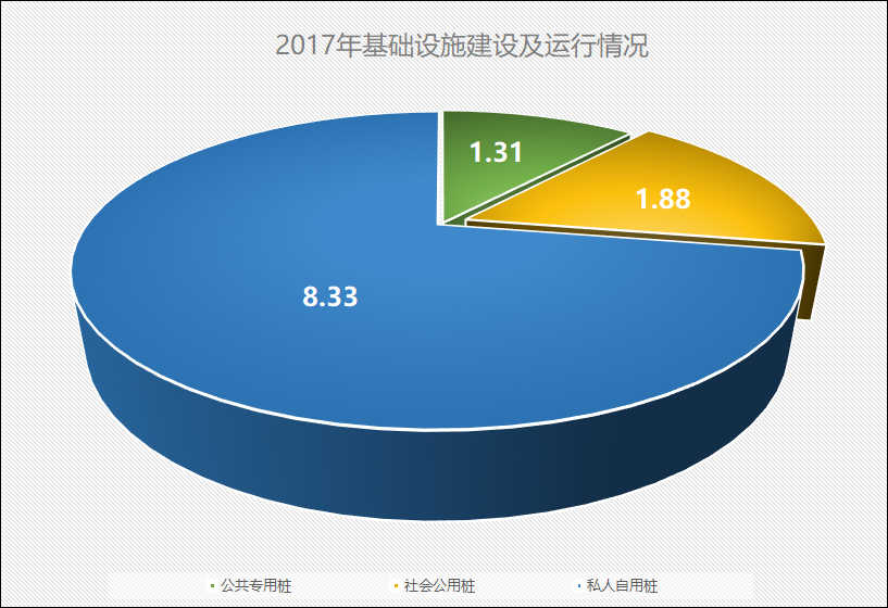 基础设施:截至2017年底,本市累计建成充电桩11.52万根,其中公共专用桩1.31万根,社会公用桩1.88万根,私人自用桩8.33万根。