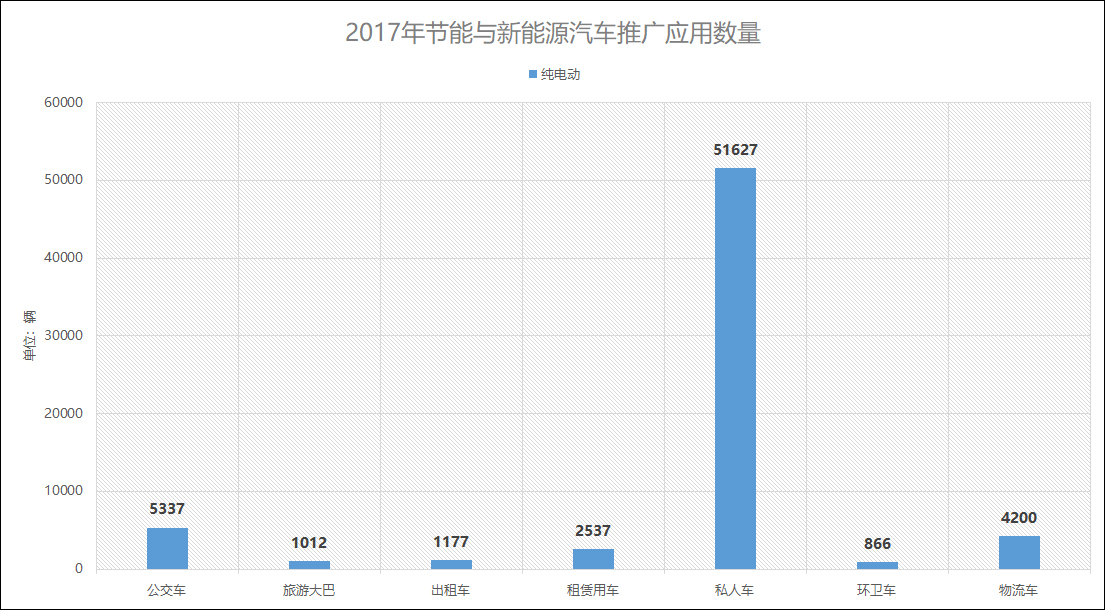 推广概况:2017年,北京市新增上牌电动汽车6.7万辆,累计推广17.1万辆。公共领域示范全年推广电动汽车1.5万辆;私人领域单月上牌量稳步增长,2017年新增5.2万辆,全市累计达到12.4万辆。纯电动汽车2017年共计推广应用66756辆,包括公交车5337辆;旅游大巴1012辆;出租车1177辆;租赁用车2537辆;私人车51627辆;环卫车866辆;物流车4200辆。