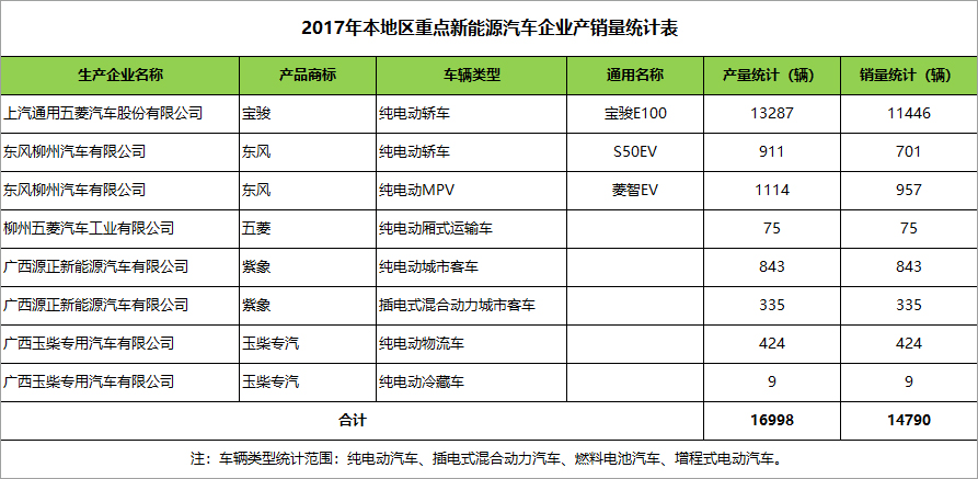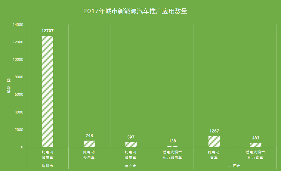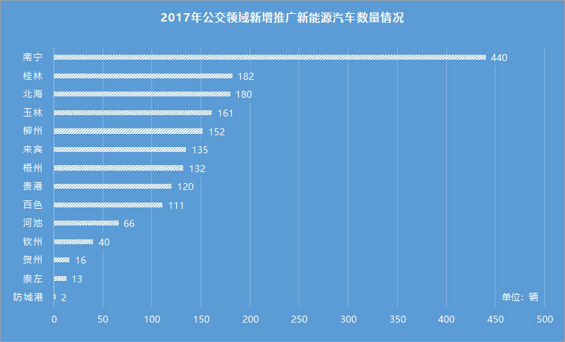2017年,广西在公交领域新增推广新能源汽车1750辆,占全部新增及更换的公交车总量的91%。其中南宁440辆、柳州152辆、桂林182辆、梧州132辆、北海180辆、防城港2辆、钦州40辆、贵港120辆、玉林161辆、贺州16辆、百色111辆、河池66辆、来宾135辆、崇左13辆。此外,上汽通用五菱在广西新增推广1.14万辆新能源轿车。