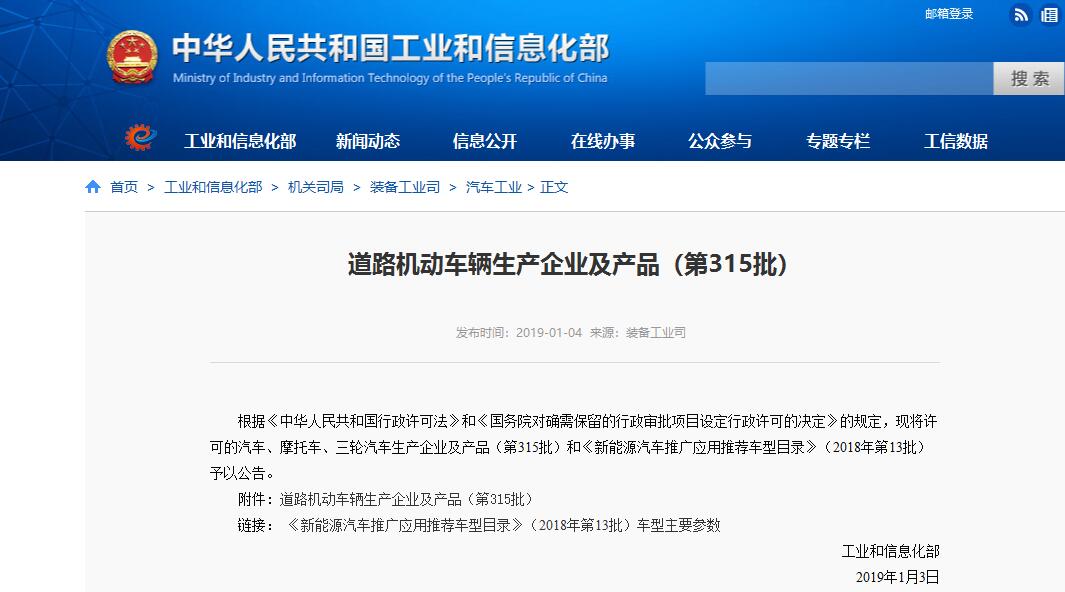 工业和信息化部于2019年1月4日发布《道路机动车辆生产企业及产品(第315批)》,本文节选了公告中新能源汽车范畴的产品进行整理统计。
