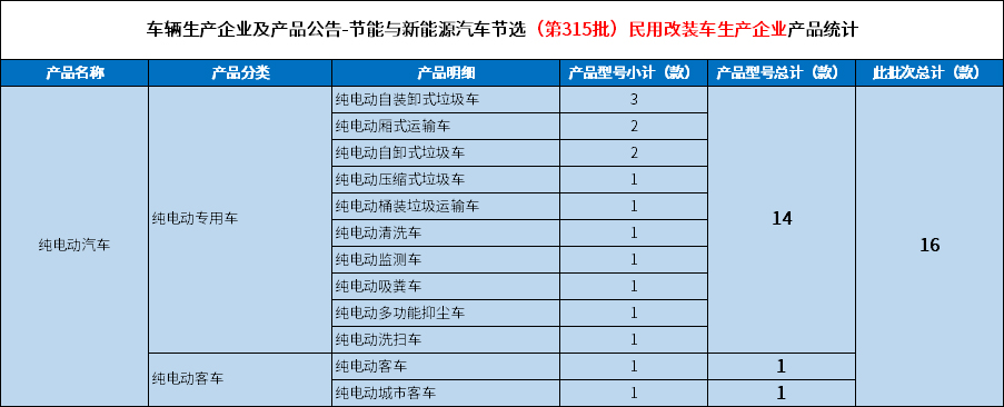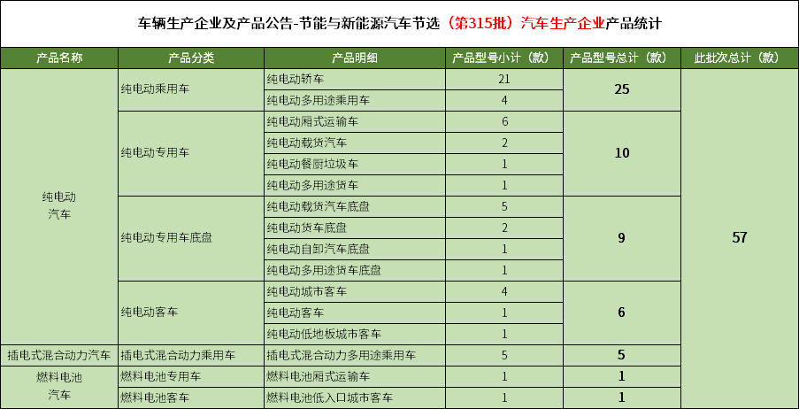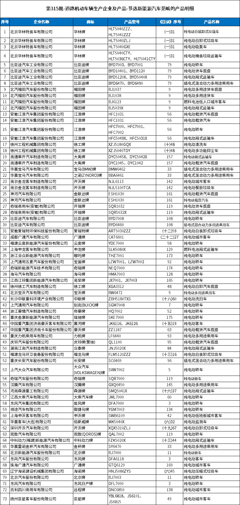 第315批-道路机动车辆生产企业及产品-节选新能源汽车范畴的产品,明细如下所示。