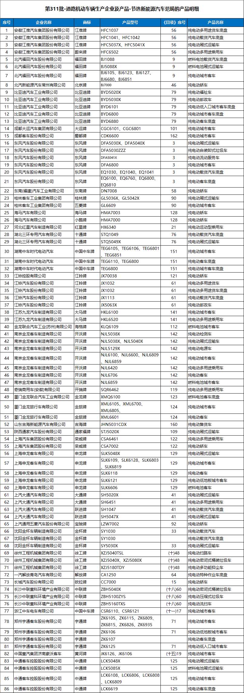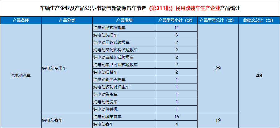 第311批-道路机动车辆生产企业及产品-节选新能源汽车范畴的产品,明细如下所示。