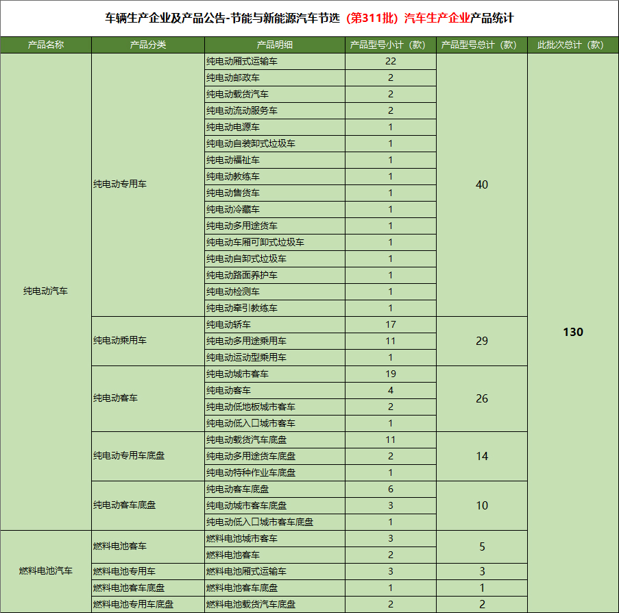 工业和信息化部于2018年9月6日发布《道路机动车辆生产企业及产品(第311批)》,本文节选了公告中新能源汽车范畴的产品进行整理统计。
