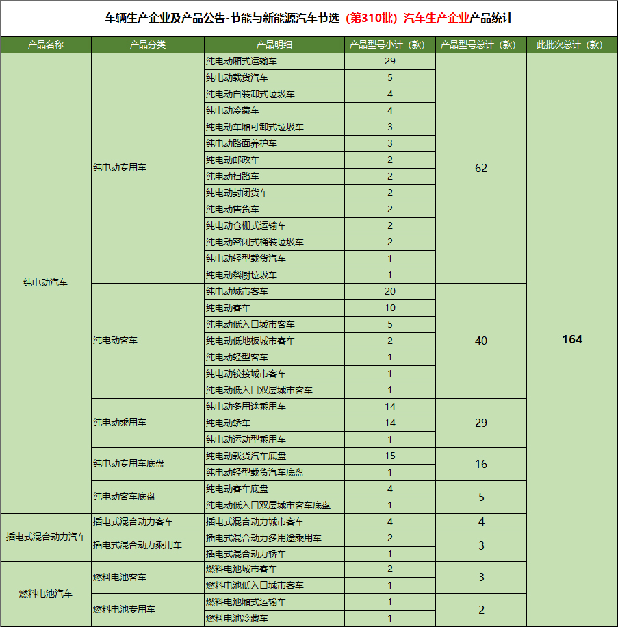 第310批-道路机动车辆生产企业及产品-节选新能源汽车范畴的产品,明细如下所示。