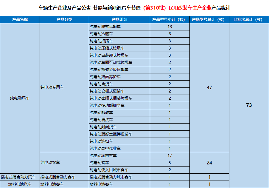 共计51个生产厂家、51个品牌、73个型号进入第310批节能与新能源汽车节选范畴,民用改装车生产企业新产品类型明细如下表所示。