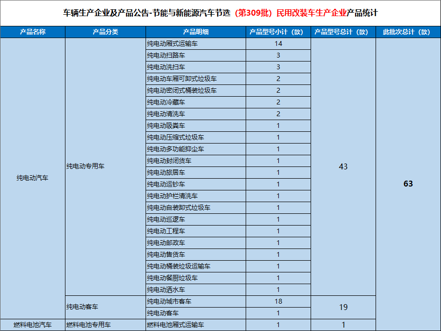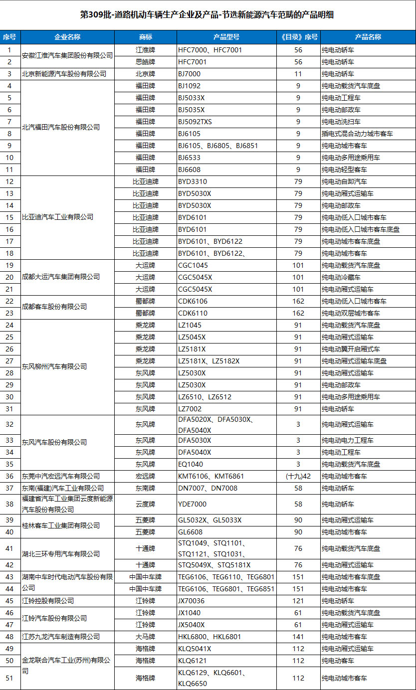 第309批-道路机动车辆生产企业及产品-节选新能源汽车范畴的产品,明细如下所示。
