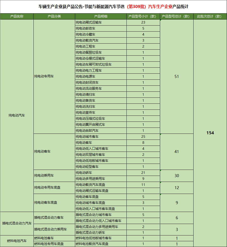 共计66个生产厂家、63个品牌、154个型号进入第309批节能与新能源汽车节选范畴,汽车生产企业新产品类型明细如下表所示。