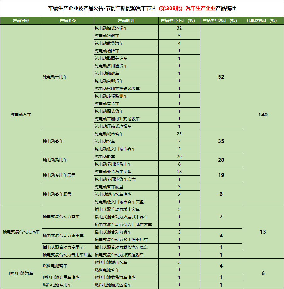 工业和信息化部于2018年6月6日发布《道路机动车辆生产企业及产品(第308批)》,本文节选了公告中新能源汽车范畴的产品进行整理统计。