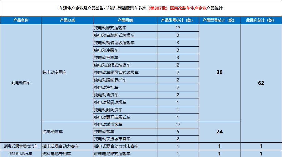 工业和信息化部于2018年5月22日发布《道路机动车辆生产企业及产品(第307批)》,本文节选了公告中新能源汽车范畴的产品进行整理统计。