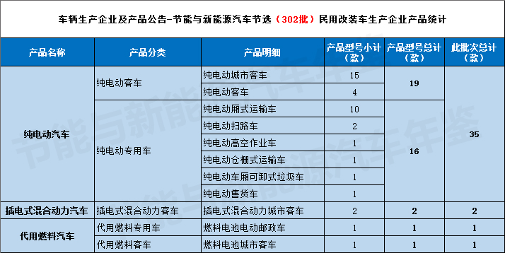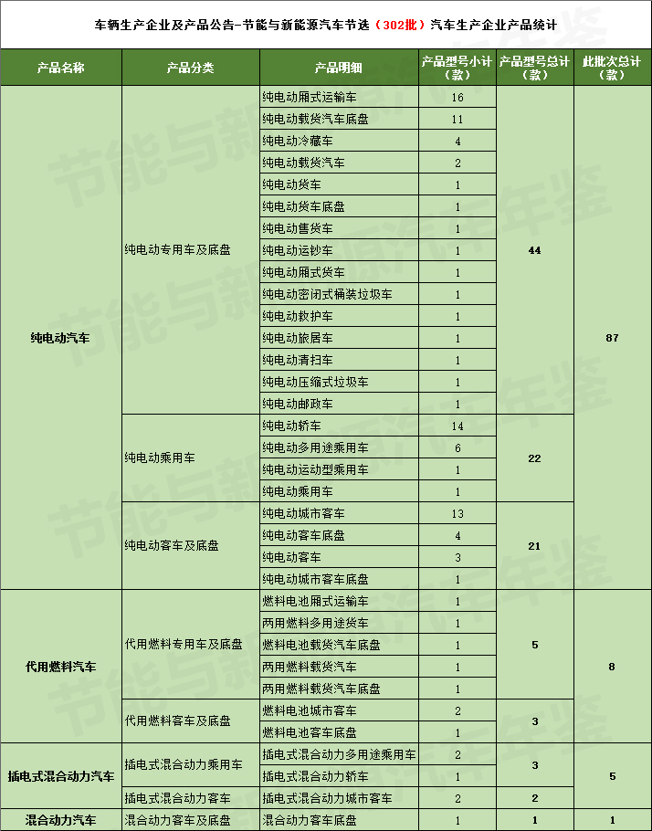 工业和信息化部于2017年12月4日发布《道路机动车辆生产企业及产品(第302批),节能与新能源汽车年鉴编制办公室统计如下: