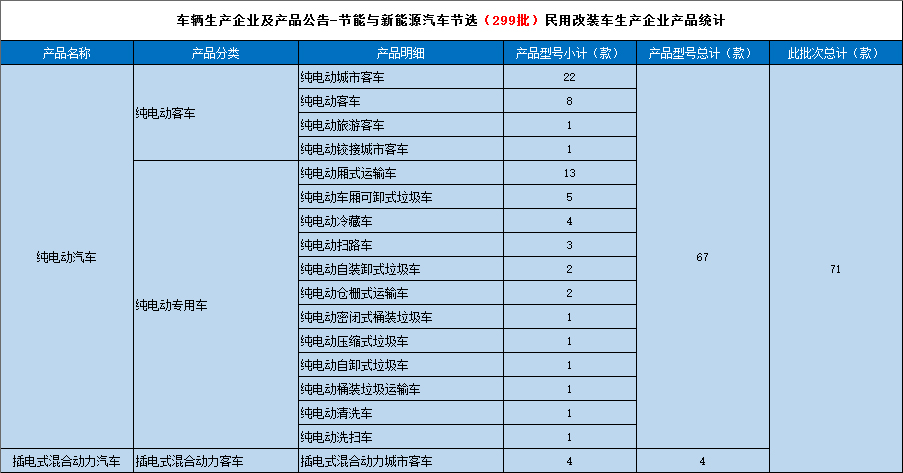 工业和信息化部于2017年9月1日发布《道路机动车辆生产企业及产品(第299批),节能与新能源汽车年鉴编制办公室统计如下: