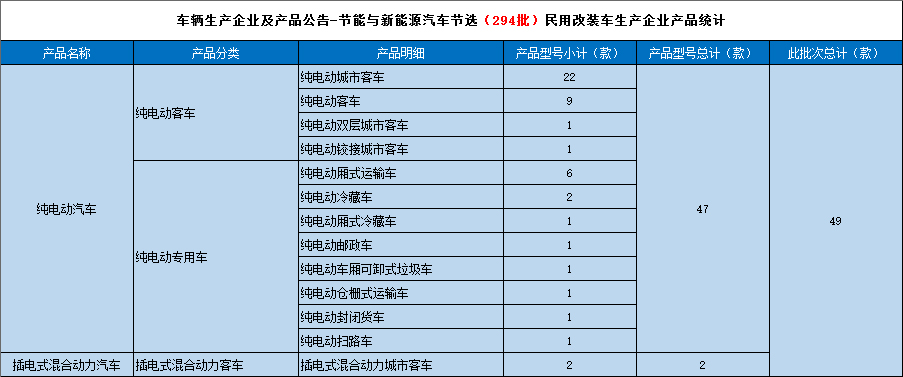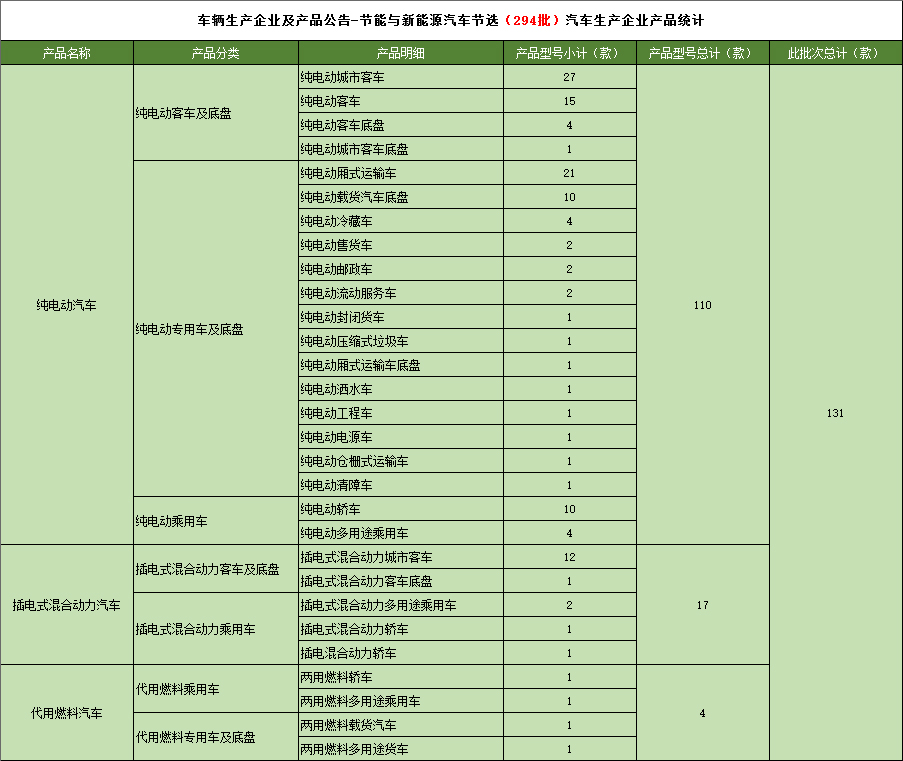 工业和信息化部于2017年4月1日发布《道路机动车辆生产企业及产品(第294批),节能与新能源汽车年鉴编制办公室统计如下: