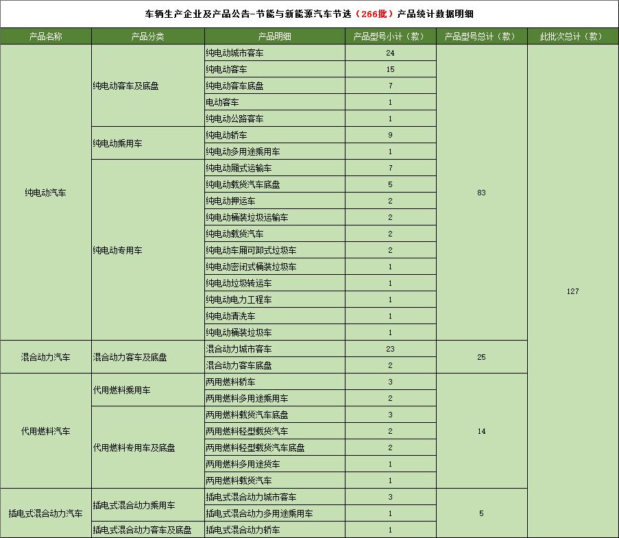 工业和信息化部于2014年11月15日发布《道路机动车辆生产企业及产品(第266批),节能与新能源汽车年鉴编制办公室统计如下:
