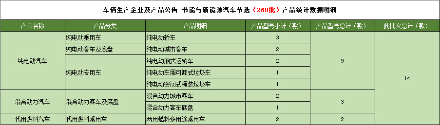 工业和信息化部于2014年5月27日发布《道路机动车辆生产企业及产品(第260批),节能与新能源汽车年鉴编制办公室统计如下: