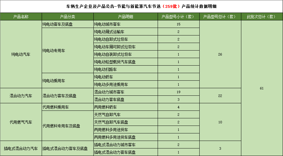 工业和信息化部于2014年4月14日发布《道路机动车辆生产企业及产品(第259批),节能与新能源汽车年鉴编制办公室统计如下: