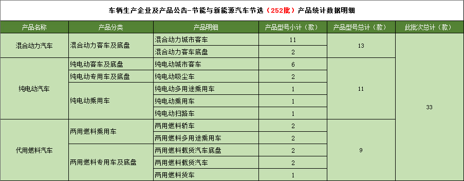 工业和信息化部于2013年9月16日发布《道路机动车辆生产企业及产品(第252批),节能与新能源汽车年鉴编制办公室统计如下: