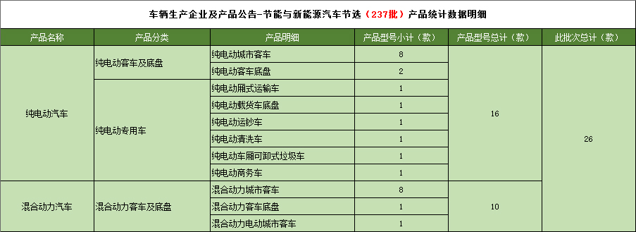 工业和信息化部于2012年6月7日发布《道路机动车辆生产企业及产品(第237批),节能与新能源汽车年鉴编制办公室统计如下: