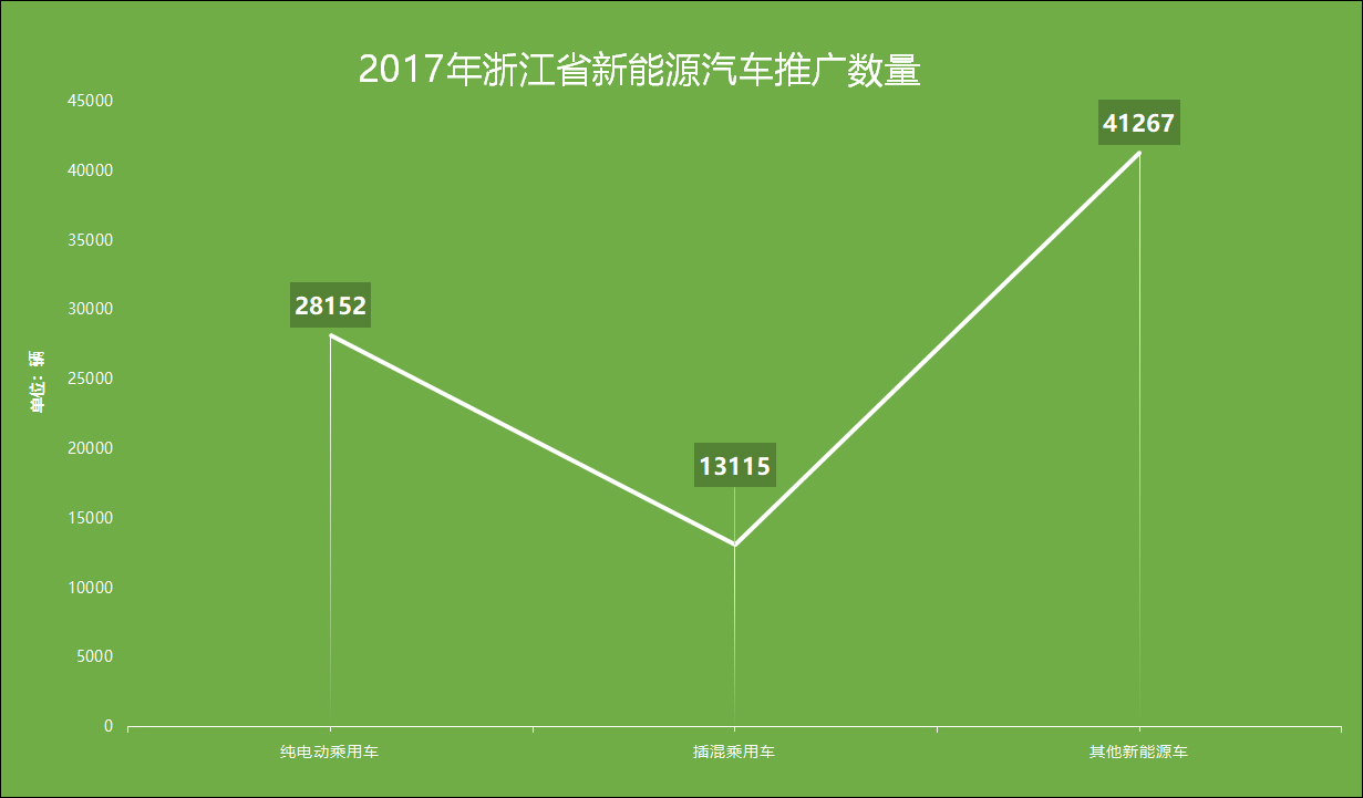 2017年,浙江省共推广新能源汽车46178辆,其中:纯电动乘用车28152辆、插电式混合动力乘用车13115辆,乘用车的比重达到89.4%。杭州市推广27950辆,占全省推广数的60%。
