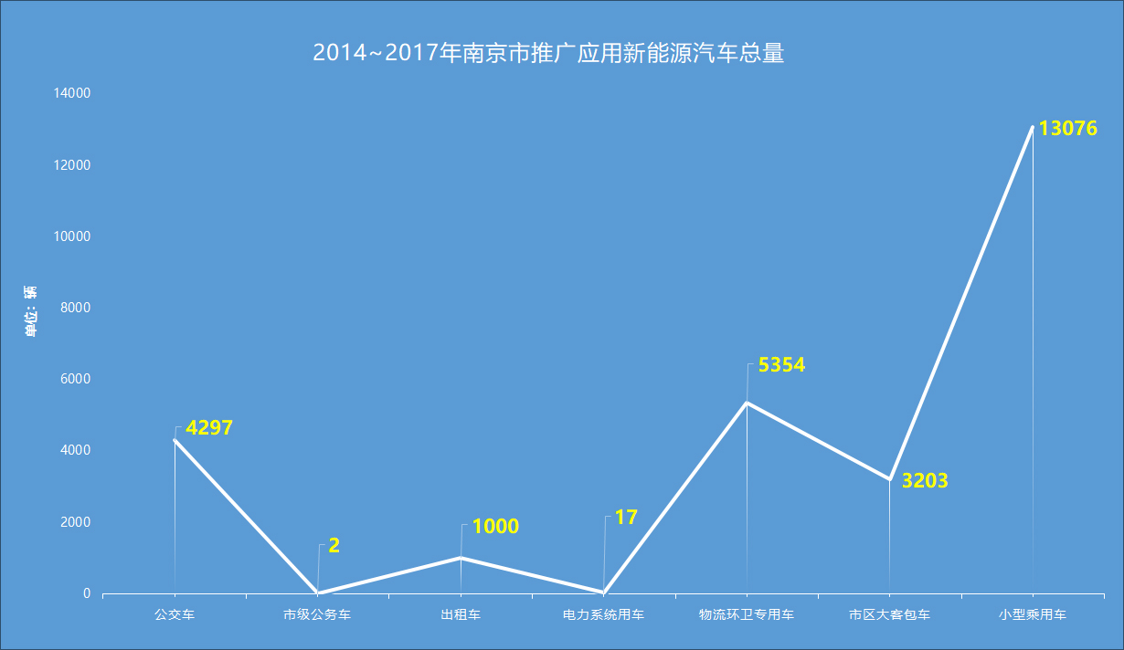 推广概况:南京市新能源汽车发展总量为26949辆,其中:新能源公交车4297辆,市级公务车2辆,出租车1000辆,电力系统用车17辆,物流、环卫等专用车5354辆,市区大客包车3203辆,各类小型乘用车13076辆。