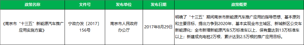 政策支持:节能与新能源汽车扶持政策1个,《南京市“十三五”新能源汽车推广应用实施方案》。