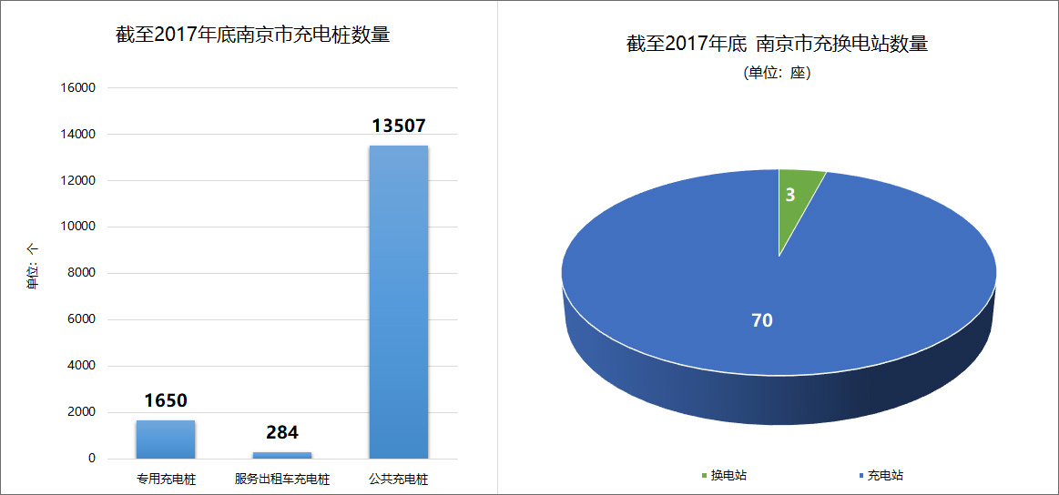 基础设施:南京市建有3座专用换电站(服务换电式公交车)、70座充电站(服务充电式公交车)、1650根专用充电桩、284根充电桩(服务出租汽车);已建成社会公用交、直流充电桩共计13507根,充换电网络初步建立。