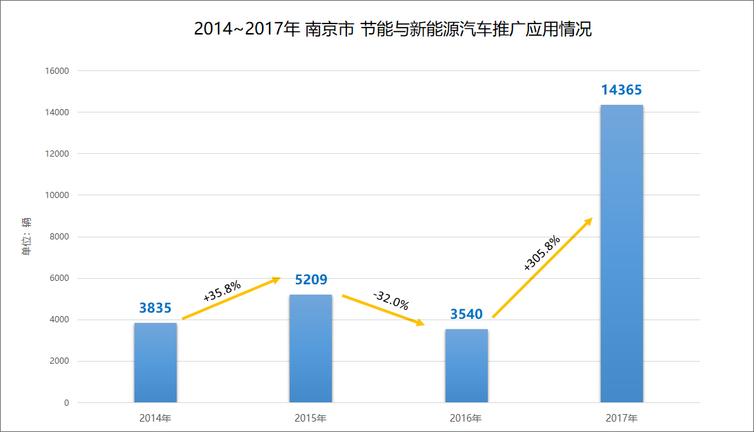 1、车辆推广应用:南京市新能源汽车发展总量为26949辆(2014年3835辆、2015年5209辆、2016年3540辆、2017年14365辆),其中:新能源公交车4297辆,市级公务车2辆,出租车1000辆,电力系统用车17辆,物流、环卫等专用车5354辆,市区大客包车3203辆,各类小型乘用车13076辆。