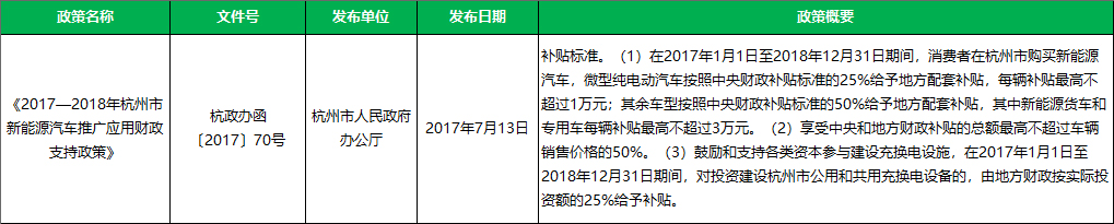 政策支持:节能与新能源汽车扶持政策1个,《2017—2018年杭州市新能源汽车推广应用财政支持政策》。