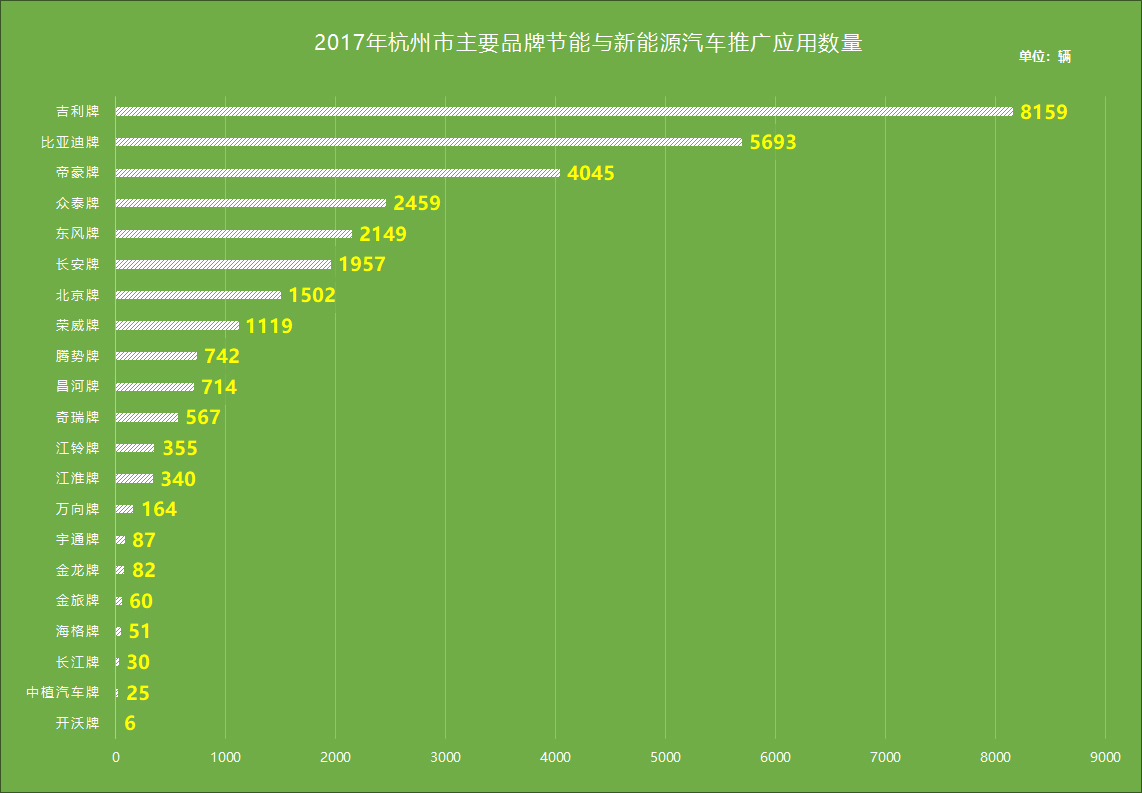 推广概况:2017年,杭州市共推广新能源汽车30306辆,其中新能源公交车580辆、物流车1160辆、环卫车60辆,个人购买新能源汽车12796辆,网约车和租赁车16004辆。