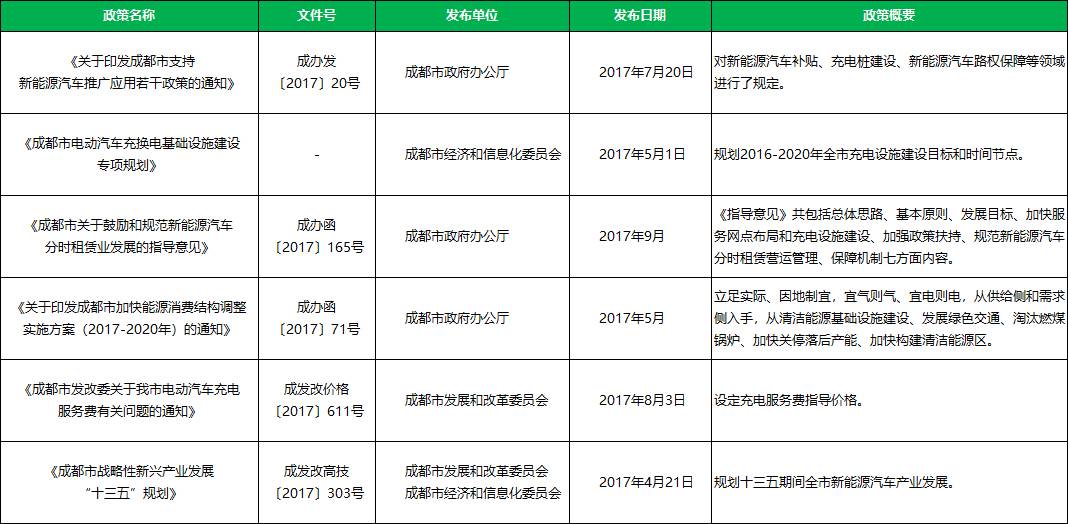 政策支持:节能与新能源汽车扶持政策6个,《关于印发成都市支持新能源汽车推广应用若干政策的通知》、《成都市电动汽车充换电基础设施建设专项规划》、《成都市关于鼓励和规范新能源汽车分时租赁业发展的指导意见》、《关于印发成都市加快能源消费结构调整实施方案(2017-2020年)的通知》、《成都市发改委关于我市电动汽车充电服务费有关问题的通知》、《成都市战略性新兴产业发展“十三五”规划》。