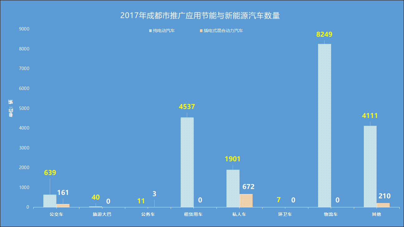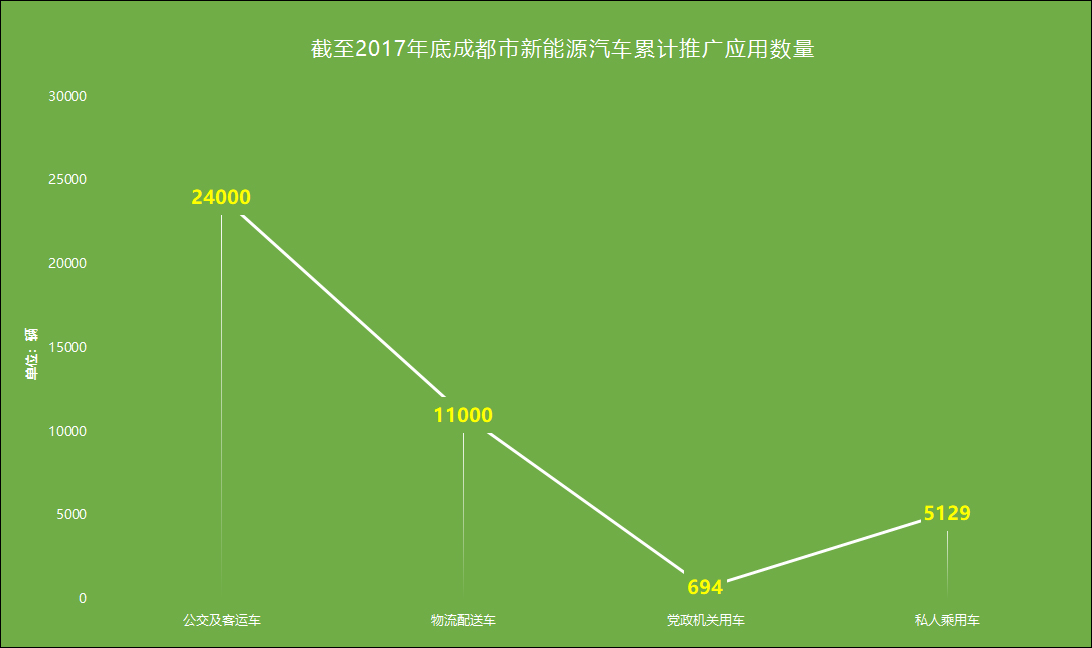 推广概况:截至2017年底,成都市累计推广应用新能源汽车超过4万辆,包括公共交通及客运车辆2.4万辆、物流配送车1.1万辆、党政机关用车694辆和私人乘用车5129辆。