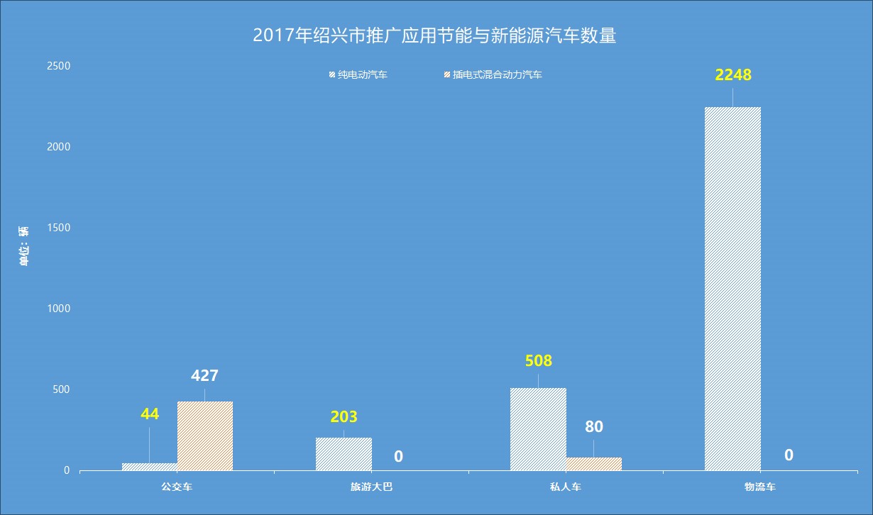 2017年,绍兴市共推广各类新能源汽车3510辆,其中,纯电动汽车3003辆,插电式混合动力汽车507辆,折合标准车9059辆,超额完成浙江省省部署任务。