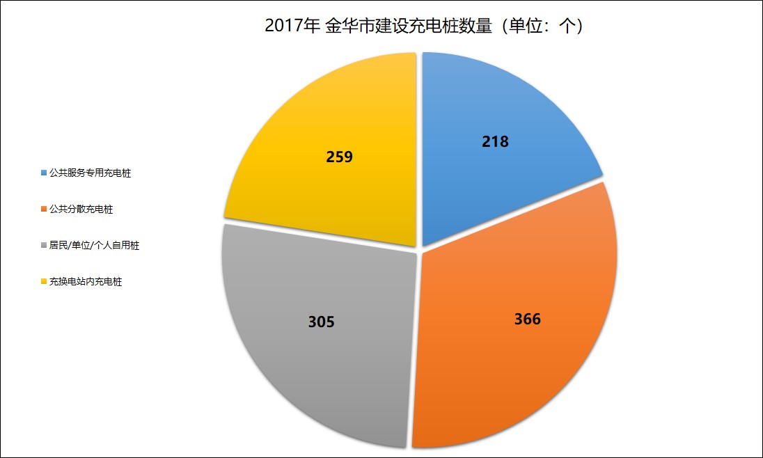 基础设施:2017年,金华市完成公交等公共服务专用充电桩218个;城市公用充换电站46座,站内桩数259个;公用分散充电桩366个;居民区/单位内部/个人等自用桩305个。共完成充电桩1148个。