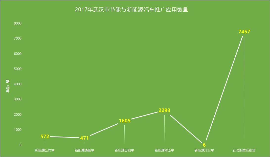 推广概况:2017年,武汉市新能源汽车新增上牌12404辆,较2016年增长245.1%。其中新能源公交车572辆;新能源通勤车471辆;新能源出租车1605辆;新能源物流车2293辆;新能源环卫车6辆;社会购置及租赁的新能源乘用车7457辆。