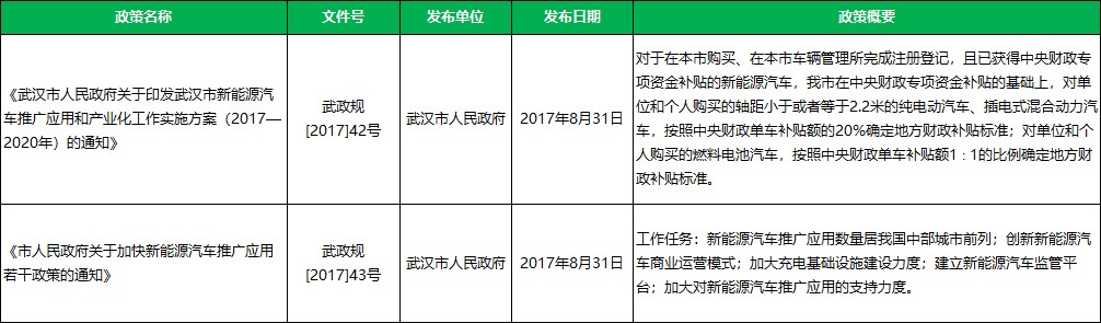 政策支持:节能与新能源汽车扶持政策2个,《武汉市人民政府关于印发武汉市新能源汽车推广应用和产业化工作实施方案(2017—2020年)的通知》、《市人民政府关于加快新能源汽车推广应用若干政策的通知》。