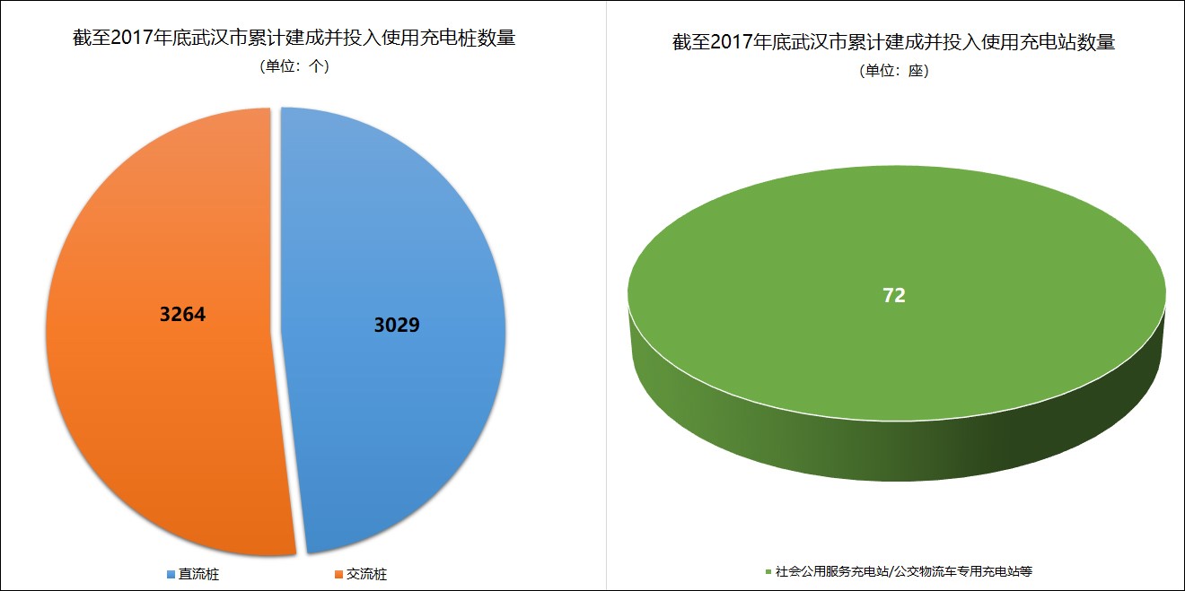 武汉市全力推动充电设施基础建设,截至2017年底,武汉市已累计建成并投入使用的社会公用服务充电站及公交车、物流车专用充电站等共计72座,公共充电桩建设数量为6293个,其中直流桩3029个、交流桩3264个。