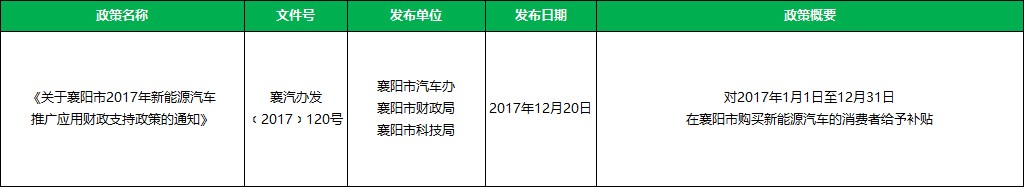 政策支持:节能与新能源汽车扶持政策1个,《关于襄阳市2017年新能源汽车推广应用财政支持政策的通知》。