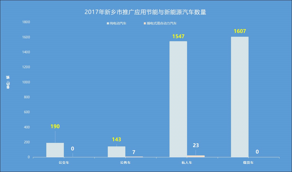 2017年,新乡市共推广新能源汽车3517辆(含进口车7辆),其中:纯电动客车190辆、纯电动厢式货车1607辆、纯电动乘用车1690辆、混合动力乘用车30辆。