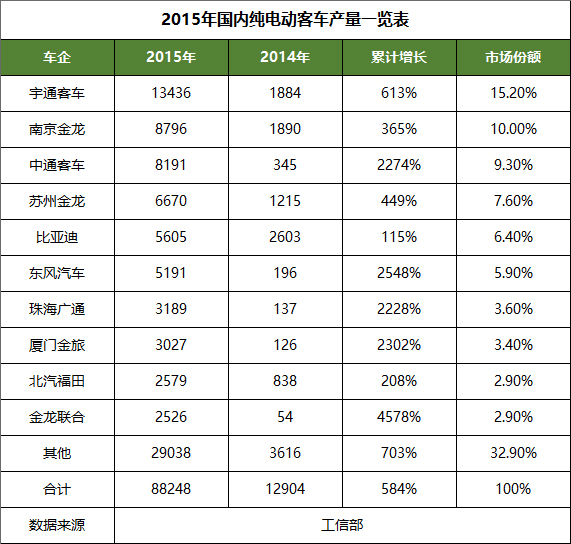 据中国汽车工业协会数据统计,在2015年新能源客车领域,纯电动客车产量为88248辆,同比增长5.8倍;2015年作为纯电动客车市场蓬勃发展的一年,很多纯电动客车难题也得到了解决,比如快充、慢充时间大大缩短,突破续驶里程、电池寿命、涉水安全等纯电动车的几大瓶颈,应用全数字控制系统,将动力系统、能源系统、辅助系统、整车控制、车身控制等集成到一个CAN网络系统中,实现了纯电动客车系统响应更快、控制更精确、能耗更低等。