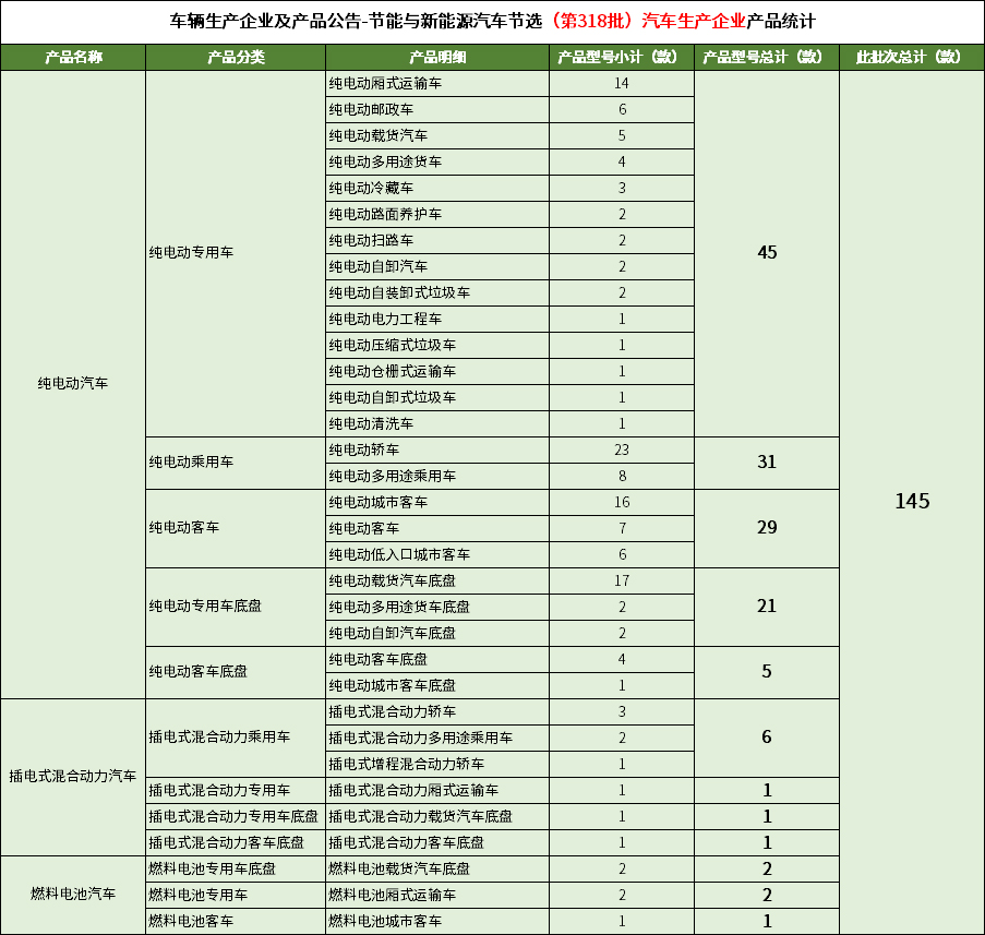 第318批-道路机动车辆生产企业及产品-节选新能源汽车范畴的产品,明细如下所示。