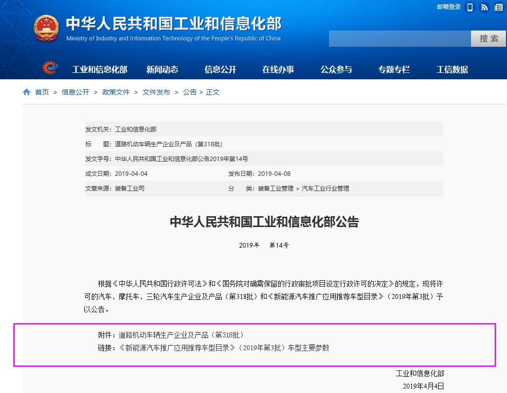 工业和信息化部于2019年4月8日发布了《道路机动车辆生产企业及产品(第318批)》,本文节选了公告中新能源汽车范畴的产品进行整理统计。